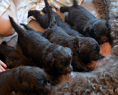 It's bathtime for Satori and Topper's pups. The Summer of Love pup are having a Love Affair with their food! They DIVE into it with reckless abandon, and, as they have few teeth, their food is still a soft semi-liquid mush...the net result is very messy puppies! Luckily, Satori's Guardian mama is here to help out washing those sweet little faces!